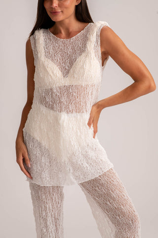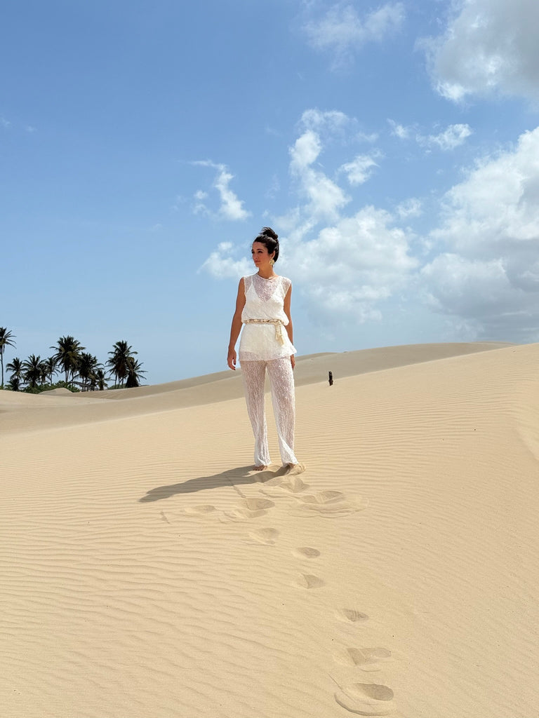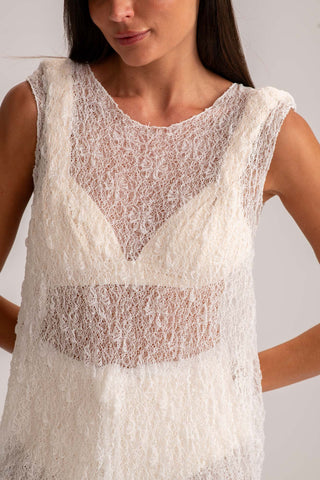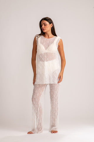 Blusa em modelagem canoa, feita em tecido rendado com ponto de crochê.