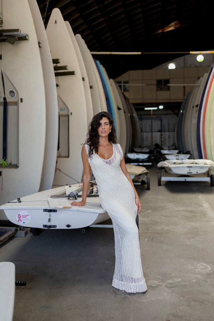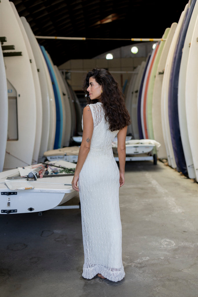 Vestido Regata Canoa Crochê Longo Off White.