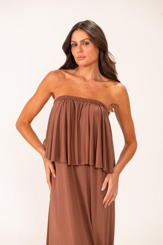 Vestido em modelagem tomara que caia, com detalhe em macramê, babado e longo.