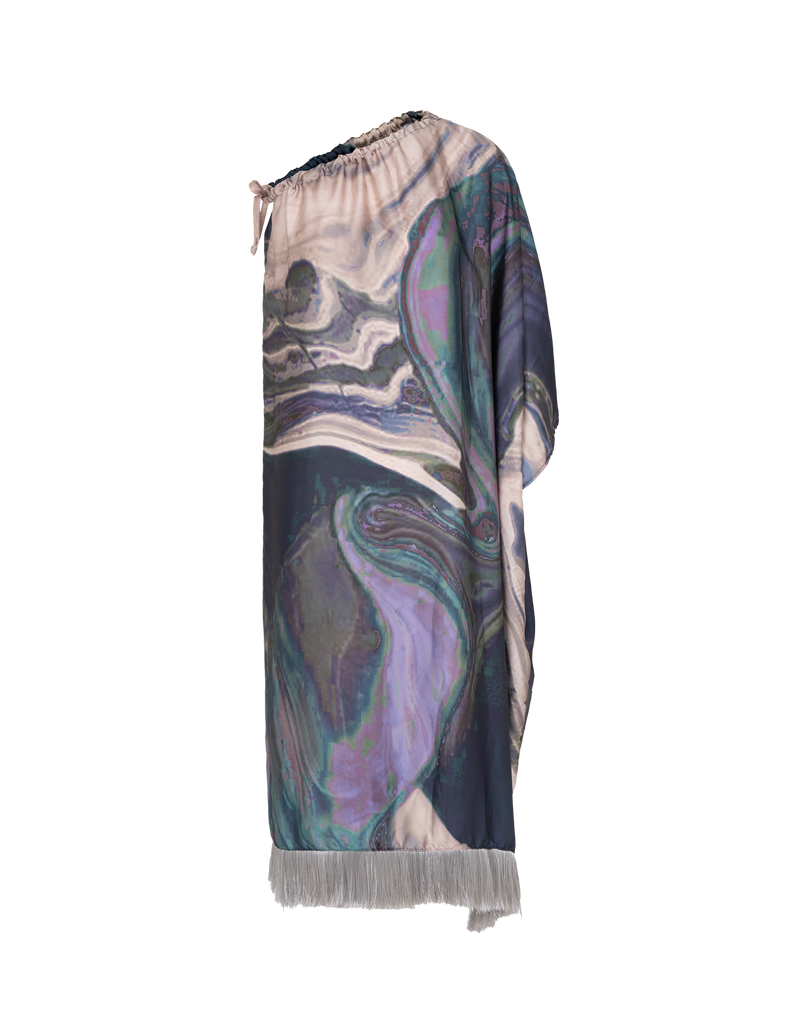 Kaftan Um Ombro Franja Cetim Compose Pétala Petróleo